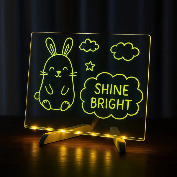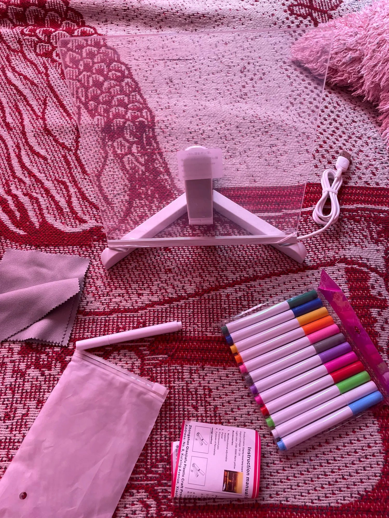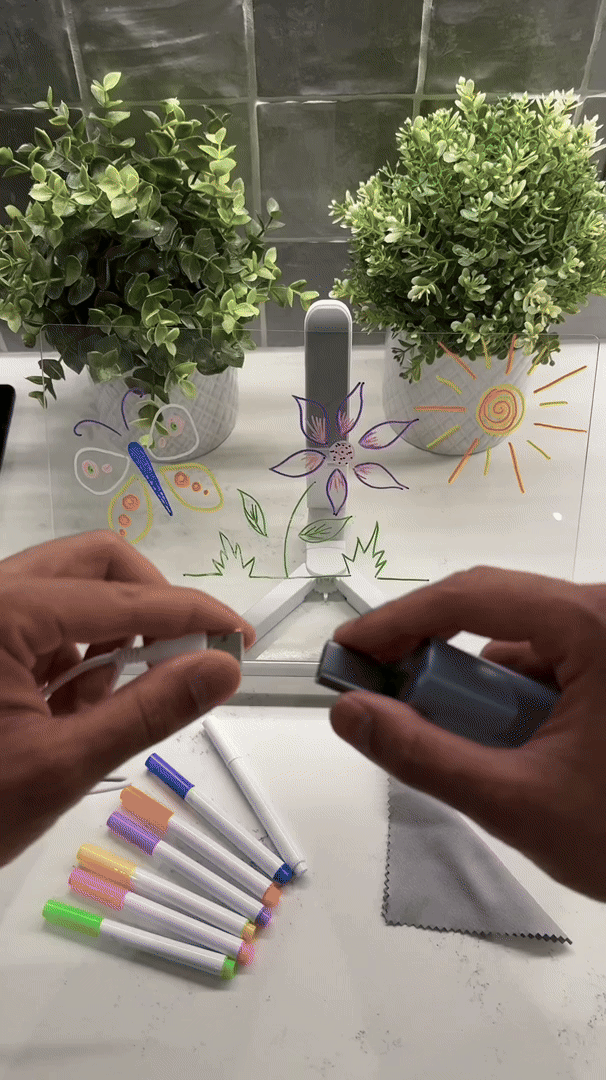 Tot ce trebuie să faceți este să conectați cablul USB, să aprindeți lumina și să desenați cu markerele incluse. Desenele se șterg imediat cu o lavetă moale — simplu, rapid și fără murdărie.